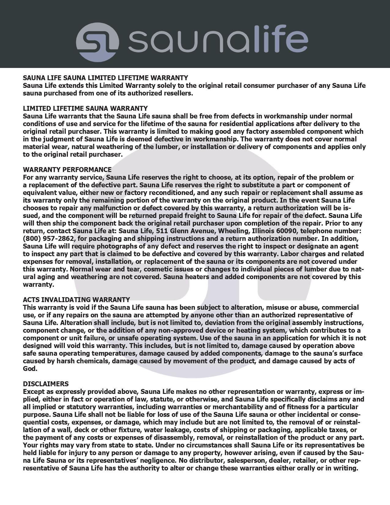 *Limited Lifetime Warranty of Sauna Products is 5 years on wood structure (when properly maintained),control panel, and applicable control panel harnesses and lights from the date of purchase. Stove/heater iscovered under its manufacturer’s applicable warranty.