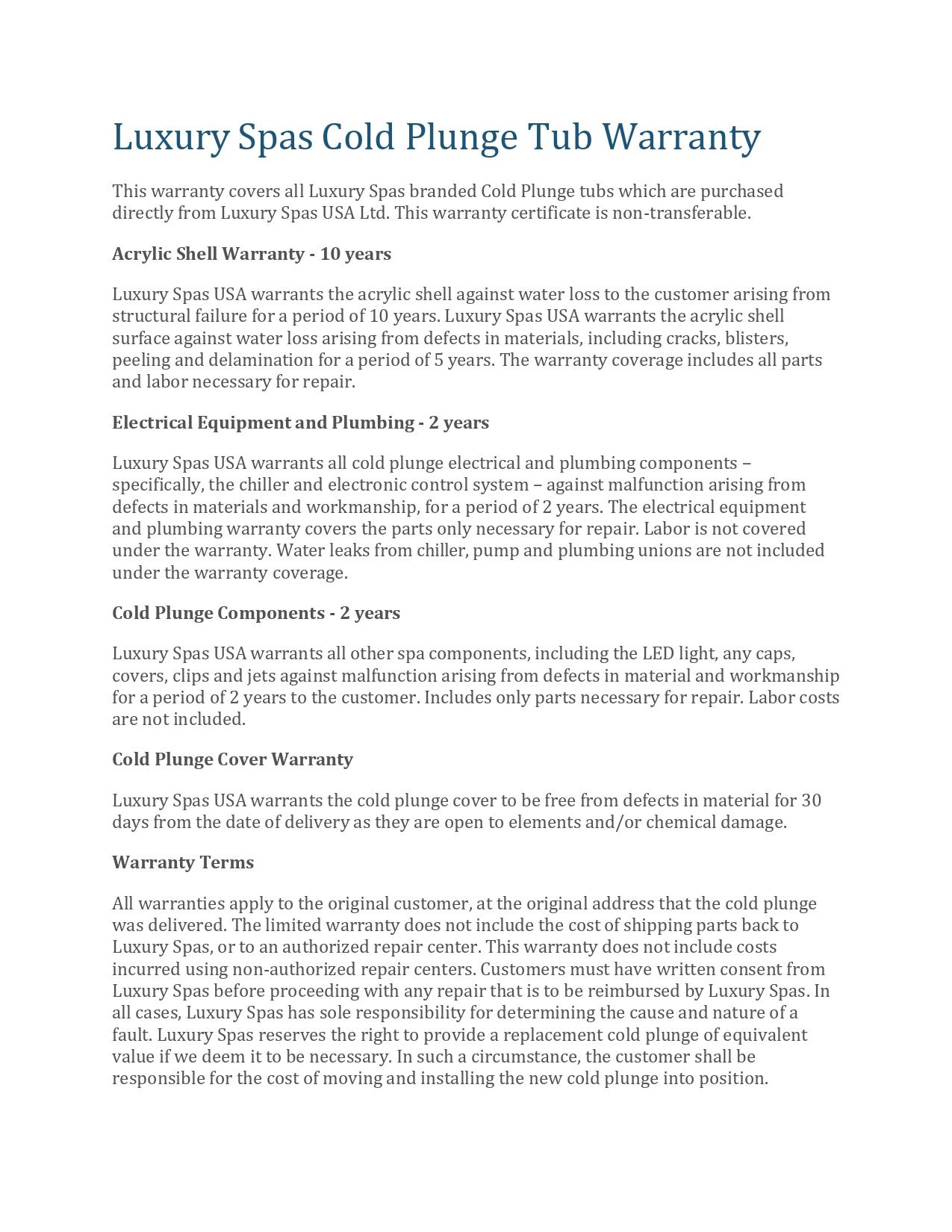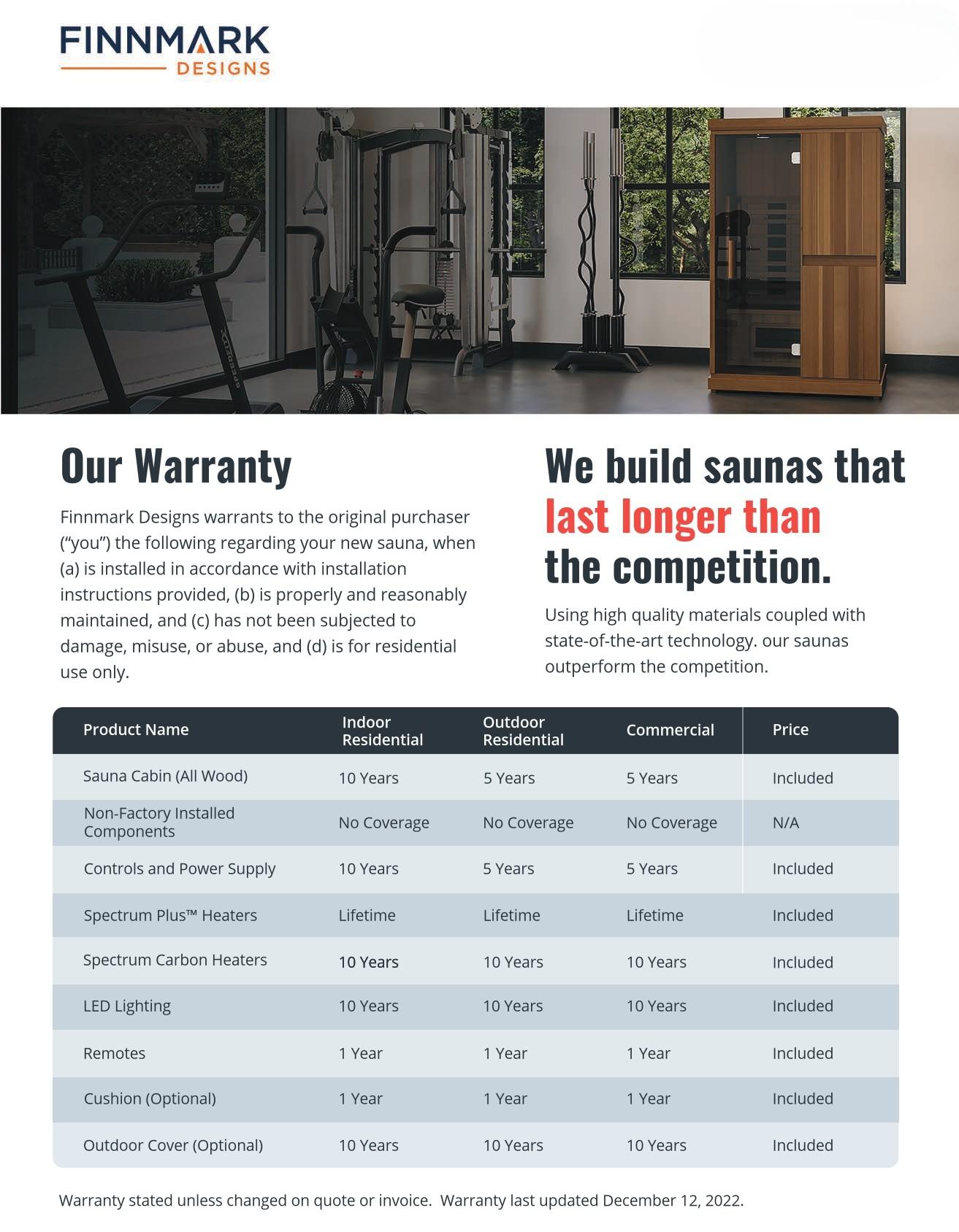 The 7-Year SunRay Warranty covers the structure of the sauna which includes the wooden sauna cabin and all glass parts. All parts including electronic parts and heaters have a 1-Year Warranty.