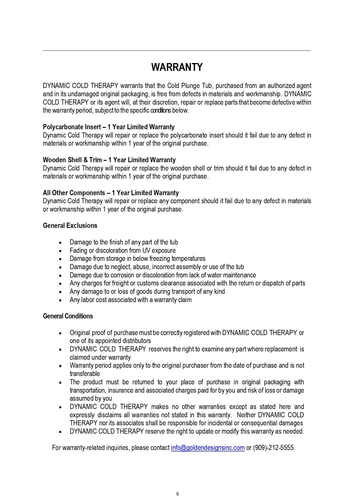 Extent of Warranty: This limited warranty applies to products manufactured or distributed by GoldenDesigns, Inc. under the Golden Designs Inc. brand name, delivered in the contiguous United States orCanada and extends to the original purchaser at the original site of installation only. This warrantybecomes valid at time of purchase and terminates either by specified time frame, owner transfer, orrelocation. The warranty extends to the sauna room and excludes the heater as it is covered by its ownmanufacturer warranty. Your sales receipt showing the date of purchase of the product is your proof ofpurchase.