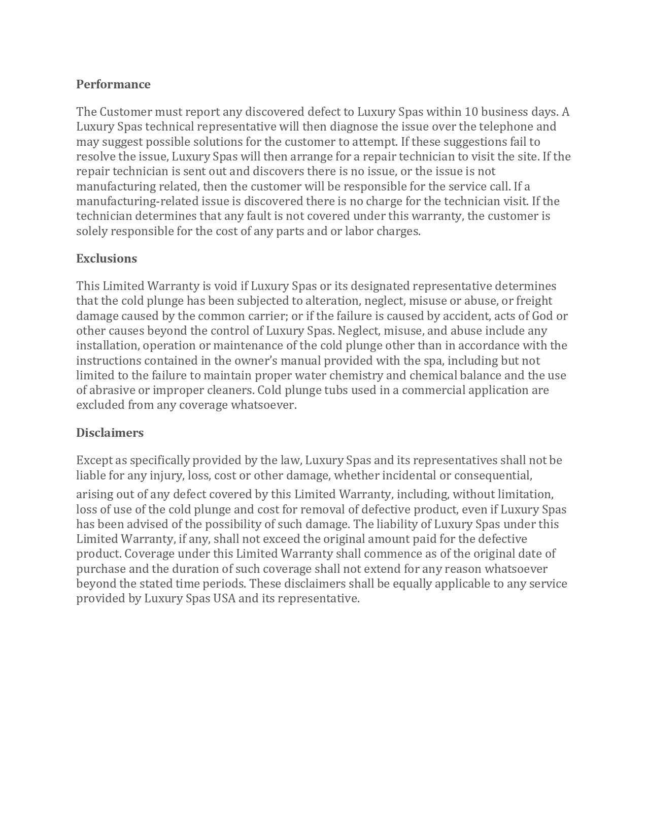 Warranty claims will only be resolved with the repair of the current product through a parts replacement or shipment of a replacement product. If the warranty claims department determines that the sauna must be returned, it must be returned with a receipt showing date of purchase, purchase price, and the dealer from which the sauna was purchased. No warranty claim will be honored without a receipt. Improper use or installation or damage resulting from acts of nature is not covered under the sauna warranty. No other warranties expressed or implied shall be in effect in lieu of the 7-Year