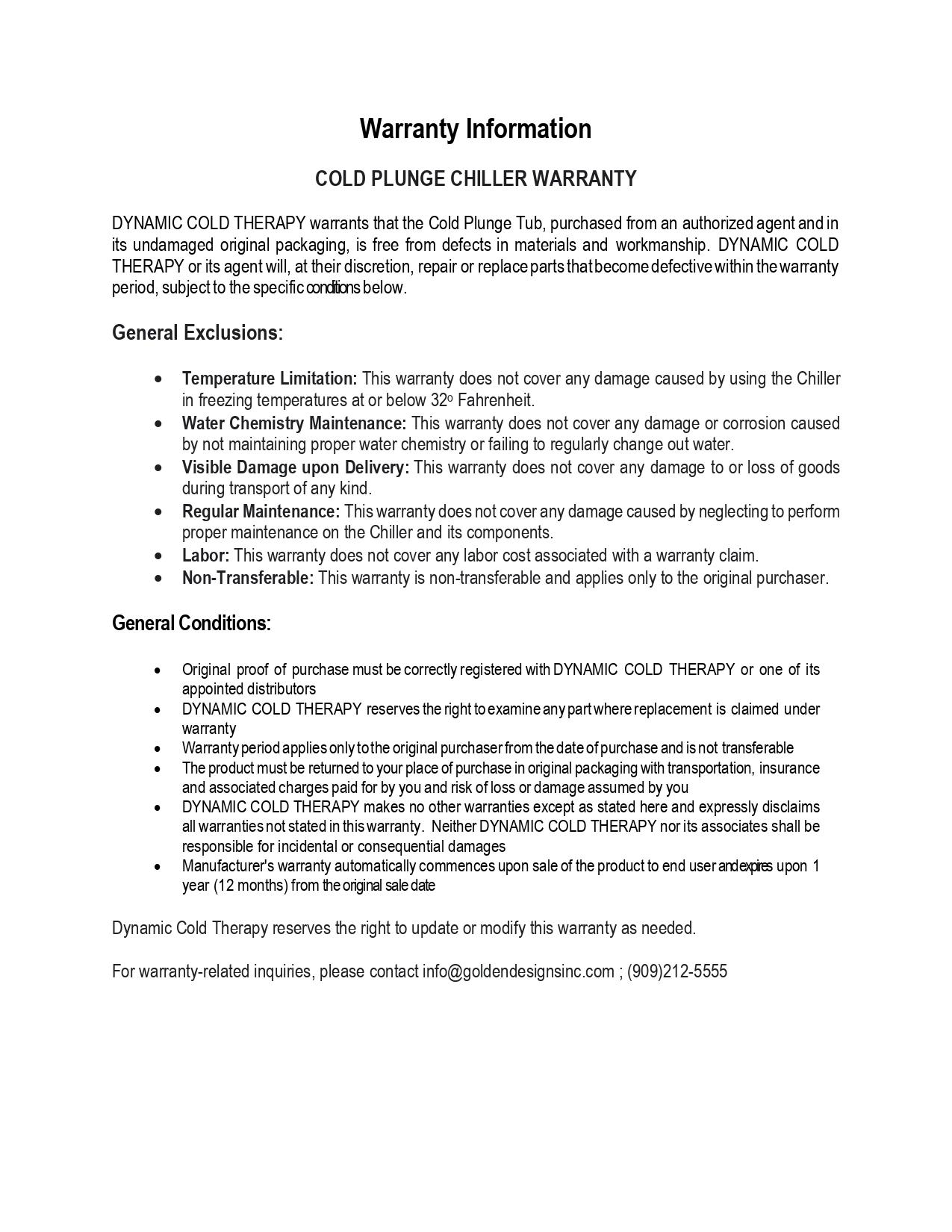 This warranty does not apply if the unit has been subject to full commercial use, negligence, alteration,modification, misuse, abuse, repairs by non-Golden Designs, Inc. authorized personnel, inappropriateinstallations, or any case beyond the control of Golden Designs, Inc. invalidating this warranty including butare not limited to:
